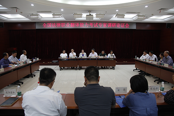 中國外文局人事部主任、翻譯專業(yè)資格考試領(lǐng)導(dǎo)小組成員兼全國翻譯專業(yè)資格(水平)考試辦公室主任閔藝、國家人社部人考中心資格一處處長王世潮出席會議。來自中央政法有關(guān)單位、中央和國家機(jī)關(guān)有關(guān)部門、企業(yè)和高校領(lǐng)導(dǎo)以及法律界的近30位專家參加會議。調(diào)研會由全國翻譯專業(yè)資格(水平)考試辦公室副主任兼考評中心代主任王繼雨主持。